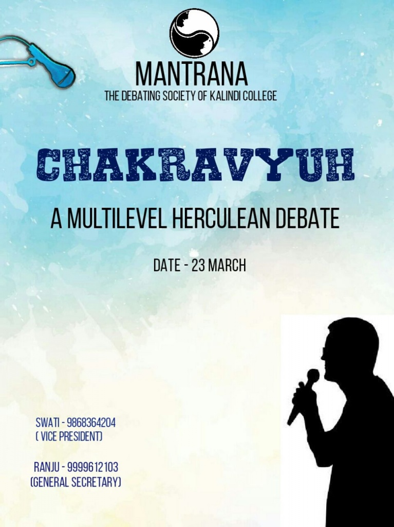 “We don’t all see things the same way. Wisdom is learning to appreciate the view from another person’s vantage point” with this adage by Susan Hale, Mantrana, the Debating Society of Kalindi College finds great pleasure in commemorating the second edition of its Annual Debating Festival, Vantage’17, to be held on 10th and 11th of April.